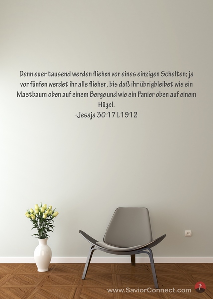 Denn euer tausend werden fliehen vor eines einzigen Schelten; ja vor fünfen werdet ihr alle fliehen, bis daß ihr übrigbleibet wie ein Mastbaum oben auf einem Berge und wie ein Panier oben auf einem Hügel. -Jesaja 30:17 L1912
