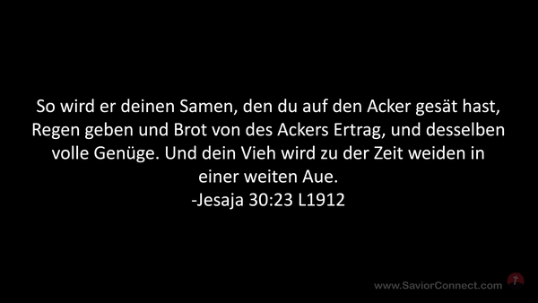 So wird er deinen Samen, den du auf den Acker gesät hast, Regen geben und Brot von des Ackers Ertrag, und desselben volle Genüge. Und dein Vieh wird zu der Zeit weiden in einer weiten Aue. -Jesaja 30:23 L1912