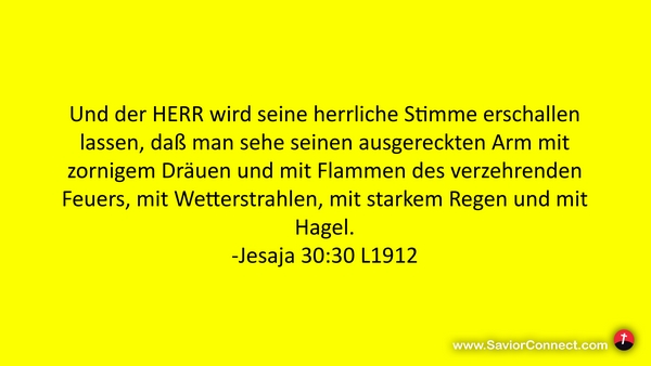 Und der HERR wird seine herrliche Stimme erschallen lassen, daß man sehe seinen ausgereckten Arm mit zornigem Dräuen und mit Flammen des verzehrenden Feuers, mit Wetterstrahlen, mit starkem Regen und mit Hagel. -Jesaja 30:30 L1912