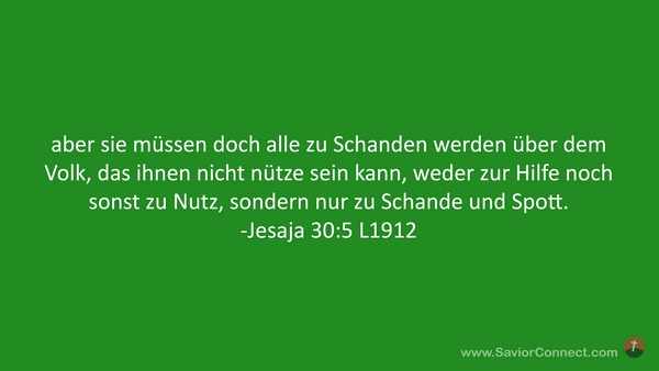 aber sie müssen doch alle zu Schanden werden über dem Volk, das ihnen nicht nütze sein kann, weder zur Hilfe noch sonst zu Nutz, sondern nur zu Schande und Spott. -Jesaja 30:5 L1912