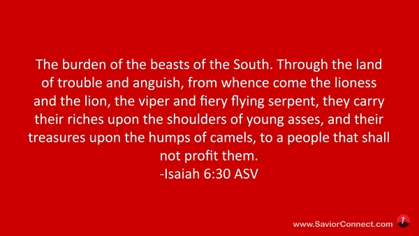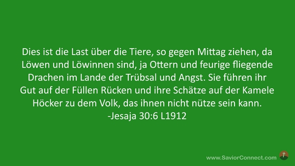 Dies ist die Last über die Tiere, so gegen Mittag ziehen, da Löwen und Löwinnen sind, ja Ottern und feurige fliegende Drachen im Lande der Trübsal und Angst. Sie führen ihr Gut auf der Füllen Rücken und ihre Schätze auf der Kamele Höcker zu dem Volk, das ihnen nicht nütze sein kann. -Jesaja 30:6 L1912