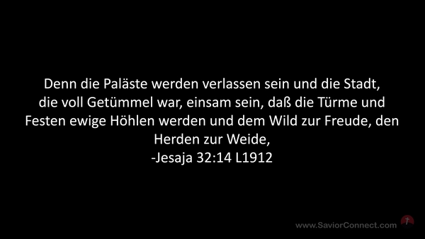 Denn die Paläste werden verlassen sein und die Stadt, die voll Getümmel war, einsam sein, daß die Türme und Festen ewige Höhlen werden und dem Wild zur Freude, den Herden zur Weide, -Jesaja 32:14 L1912