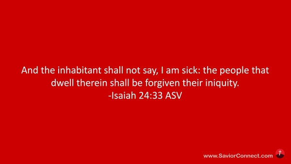Und kein Einwohner wird sagen: Ich bin schwach. Denn das Volk, das darin wohnt, wird Vergebung der Sünde haben. -Jesaja 33:24 L1912