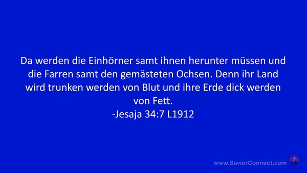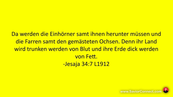 Da werden die Einhörner samt ihnen herunter müssen und die Farren samt den gemästeten Ochsen. Denn ihr Land wird trunken werden von Blut und ihre Erde dick werden von Fett. -Jesaja 34:7 L1912