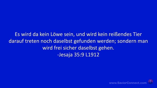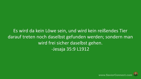 Es wird da kein Löwe sein, und wird kein reißendes Tier darauf treten noch daselbst gefunden werden; sondern man wird frei sicher daselbst gehen. -Jesaja 35:9 L1912
