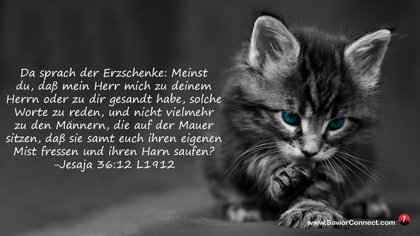 Da sprach der Erzschenke: Meinst du, daß mein Herr mich zu deinem Herrn oder zu dir gesandt habe, solche Worte zu reden, und nicht vielmehr zu den Männern, die auf der Mauer sitzen, daß sie samt euch ihren eigenen Mist fressen und ihren Harn saufen? -Jesaja 36:12 L1912