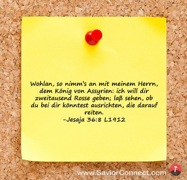Wohlan, so nimm's an mit meinem Herrn, dem König von Assyrien: ich will dir zweitausend Rosse geben; laß sehen, ob du bei dir könntest ausrichten, die darauf reiten. -Jesaja 36:8 L1912