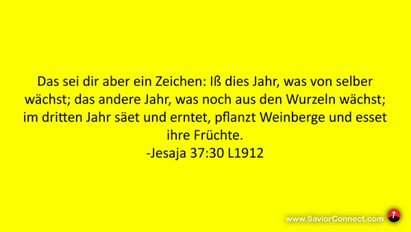 Das sei dir aber ein Zeichen: Iß dies Jahr, was von selber wächst; das andere Jahr, was noch aus den Wurzeln wächst; im dritten Jahr säet und erntet, pflanzt Weinberge und esset ihre Früchte. -Jesaja 37:30 L1912