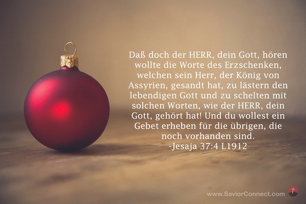 Daß doch der HERR, dein Gott, hören wollte die Worte des Erzschenken, welchen sein Herr, der König von Assyrien, gesandt hat, zu lästern den lebendigen Gott und zu schelten mit solchen Worten, wie der HERR, dein Gott, gehört hat! Und du wollest ein Gebet erheben für die übrigen, die noch vorhanden sind. -Jesaja 37:4 L1912