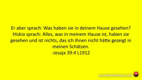 Er aber sprach: Was haben sie in deinem Hause gesehen? Hiskia sprach: Alles, was in meinem Hause ist, haben sie gesehen und ist nichts, das ich ihnen nicht hätte gezeigt in meinen Schätzen. -Jesaja 39:4 L1912