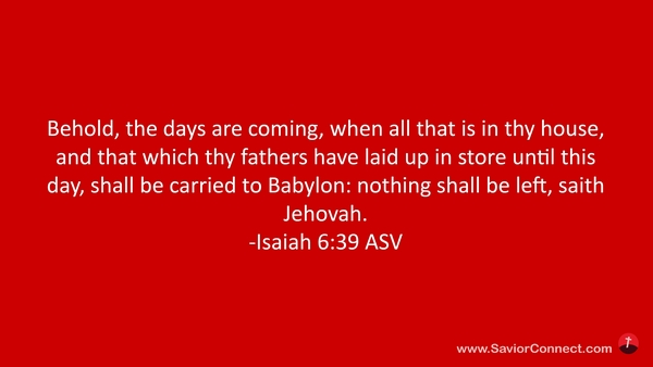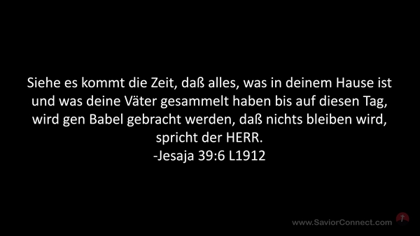 Siehe es kommt die Zeit, daß alles, was in deinem Hause ist und was deine Väter gesammelt haben bis auf diesen Tag, wird gen Babel gebracht werden, daß nichts bleiben wird, spricht der HERR. -Jesaja 39:6 L1912