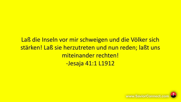 Laß die Inseln vor mir schweigen und die Völker sich stärken! Laß sie herzutreten und nun reden; laßt uns miteinander rechten! -Jesaja 41:1 L1912