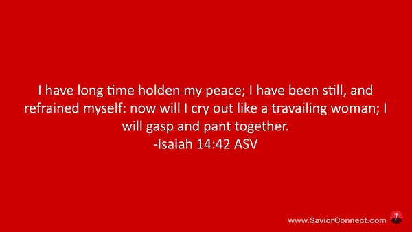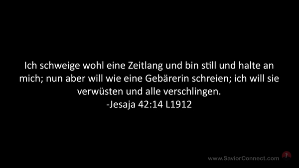 Ich schweige wohl eine Zeitlang und bin still und halte an mich; nun aber will wie eine Gebärerin schreien; ich will sie verwüsten und alle verschlingen. -Jesaja 42:14 L1912