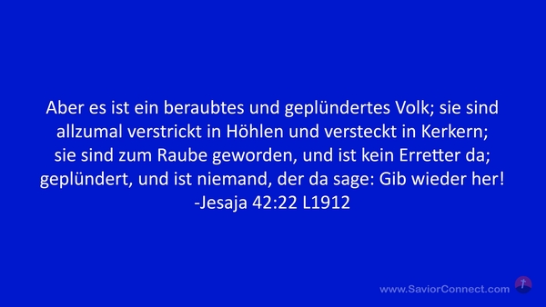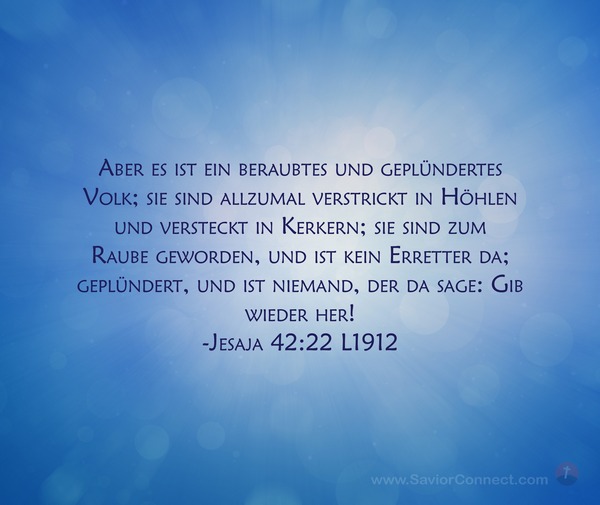 Aber es ist ein beraubtes und geplündertes Volk; sie sind allzumal verstrickt in Höhlen und versteckt in Kerkern; sie sind zum Raube geworden, und ist kein Erretter da; geplündert, und ist niemand, der da sage: Gib wieder her! -Jesaja 42:22 L1912