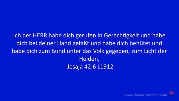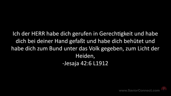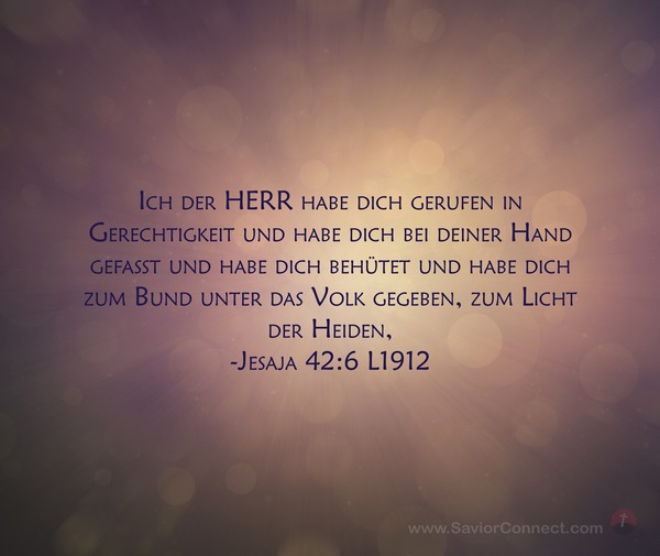 Ich der HERR habe dich gerufen in Gerechtigkeit und habe dich bei deiner Hand gefaßt und habe dich behütet und habe dich zum Bund unter das Volk gegeben, zum Licht der Heiden, -Jesaja 42:6 L1912