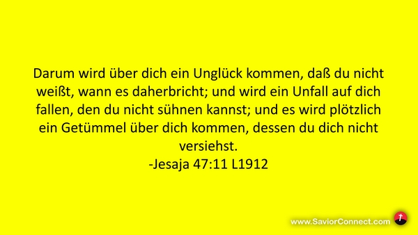 Darum wird über dich ein Unglück kommen, daß du nicht weißt, wann es daherbricht; und wird ein Unfall auf dich fallen, den du nicht sühnen kannst; und es wird plötzlich ein Getümmel über dich kommen, dessen du dich nicht versiehst. -Jesaja 47:11 L1912