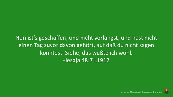 Nun ist's geschaffen, und nicht vorlängst, und hast nicht einen Tag zuvor davon gehört, auf daß du nicht sagen könntest: Siehe, das wußte ich wohl. -Jesaja 48:7 L1912