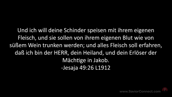 Und ich will deine Schinder speisen mit ihrem eigenen Fleisch, und sie sollen von ihrem eigenen Blut wie von süßem Wein trunken werden; und alles Fleisch soll erfahren, daß ich bin der HERR, dein Heiland, und dein Erlöser der Mächtige in Jakob. -Jesaja 49:26 L1912