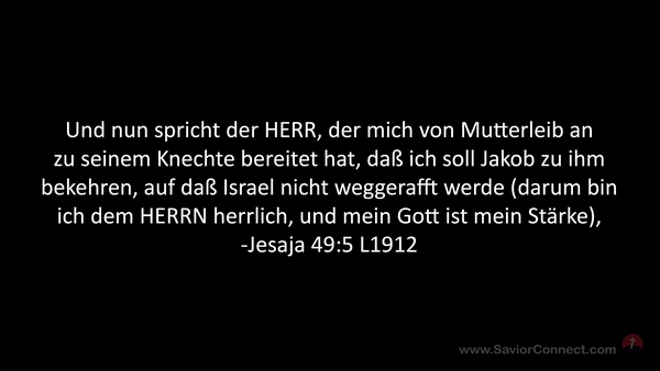 Und nun spricht der HERR, der mich von Mutterleib an zu seinem Knechte bereitet hat, daß ich soll Jakob zu ihm bekehren, auf daß Israel nicht weggerafft werde (darum bin ich dem HERRN herrlich, und mein Gott ist mein Stärke), -Jesaja 49:5 L1912