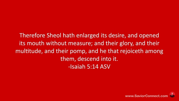 Daher hat die Hölle den Schlund weit aufgesperrt und den Rachen aufgetan ohne Maß, daß hinunterfahren beide, ihre Herrlichen und der Pöbel, ihre Reichen und Fröhlichen; -Jesaja 5:14 L1912