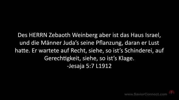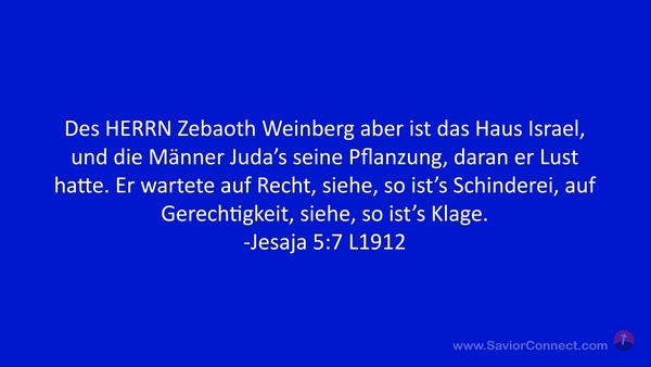 Des HERRN Zebaoth Weinberg aber ist das Haus Israel, und die Männer Juda's seine Pflanzung, daran er Lust hatte. Er wartete auf Recht, siehe, so ist's Schinderei, auf Gerechtigkeit, siehe, so ist's Klage. -Jesaja 5:7 L1912
