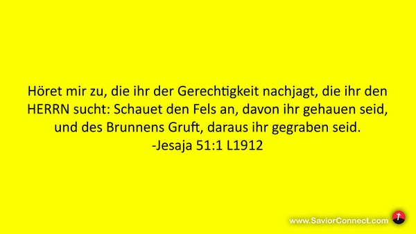 Höret mir zu, die ihr der Gerechtigkeit nachjagt, die ihr den HERRN sucht: Schauet den Fels an, davon ihr gehauen seid, und des Brunnens Gruft, daraus ihr gegraben seid. -Jesaja 51:1 L1912