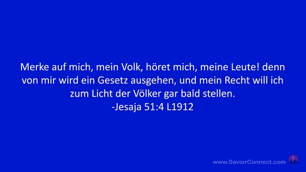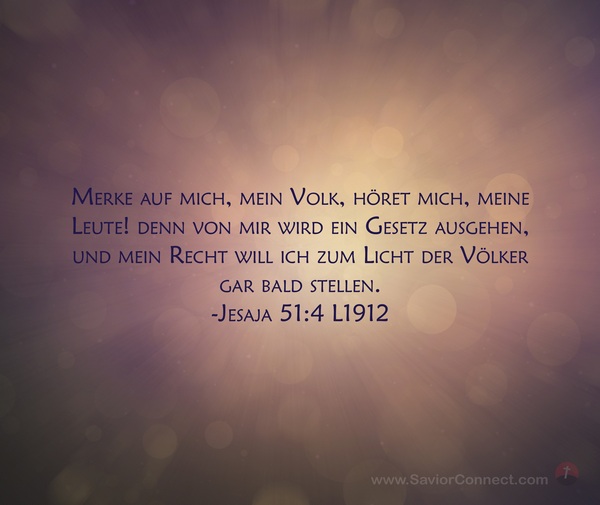 Merke auf mich, mein Volk, höret mich, meine Leute! denn von mir wird ein Gesetz ausgehen, und mein Recht will ich zum Licht der Völker gar bald stellen. -Jesaja 51:4 L1912