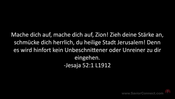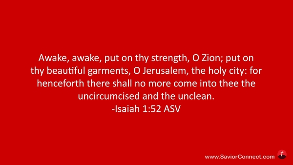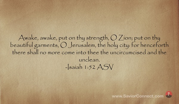Mache dich auf, mache dich auf, Zion! Zieh deine Stärke an, schmücke dich herrlich, du heilige Stadt Jerusalem! Denn es wird hinfort kein Unbeschnittener oder Unreiner zu dir eingehen. -Jesaja 52:1 L1912