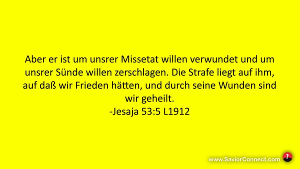 Aber er ist um unsrer Missetat willen verwundet und um unsrer Sünde willen zerschlagen. Die Strafe liegt auf ihm, auf daß wir Frieden hätten, und durch seine Wunden sind wir geheilt. -Jesaja 53:5 L1912