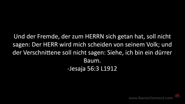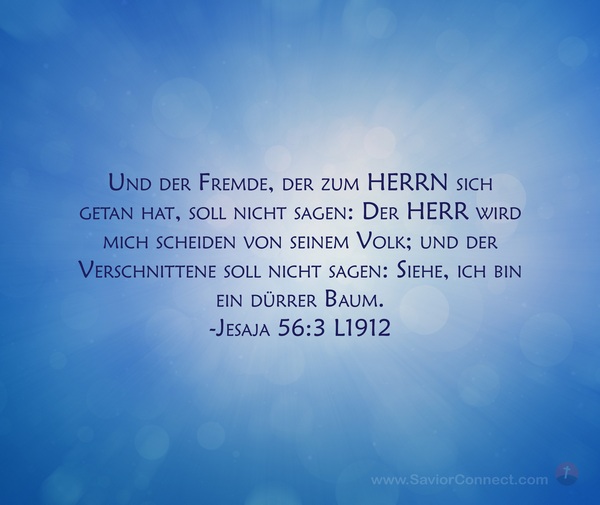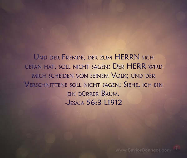 Und der Fremde, der zum HERRN sich getan hat, soll nicht sagen: Der HERR wird mich scheiden von seinem Volk; und der Verschnittene soll nicht sagen: Siehe, ich bin ein dürrer Baum. -Jesaja 56:3 L1912