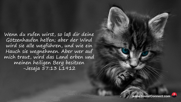 Wenn du rufen wirst, so laß dir deine Götzenhaufen helfen; aber der Wind wird sie alle wegführen, und wie ein Hauch sie wegnehmen. Aber wer auf mich traut, wird das Land erben und meinen heiligen Berg besitzen -Jesaja 57:13 L1912