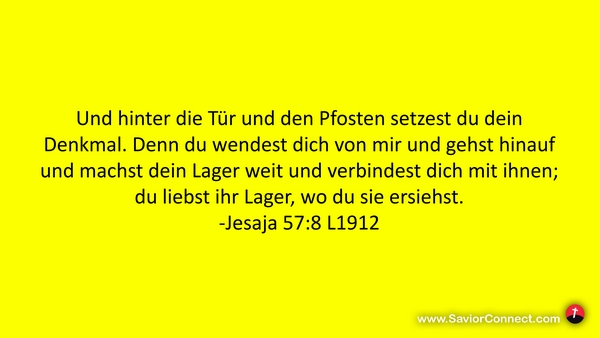 Und hinter die Tür und den Pfosten setzest du dein Denkmal. Denn du wendest dich von mir und gehst hinauf und machst dein Lager weit und verbindest dich mit ihnen; du liebst ihr Lager, wo du sie ersiehst. -Jesaja 57:8 L1912
