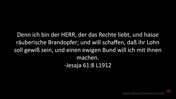 Denn ich bin der HERR, der das Rechte liebt, und hasse räuberische Brandopfer; und will schaffen, daß ihr Lohn soll gewiß sein, und einen ewigen Bund will ich mit ihnen machen. -Jesaja 61:8 L1912
