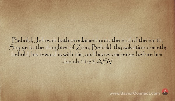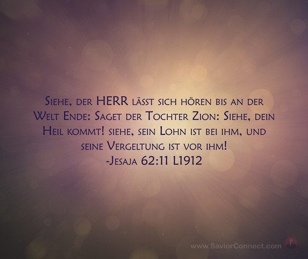Siehe, der HERR läßt sich hören bis an der Welt Ende: Saget der Tochter Zion: Siehe, dein Heil kommt! siehe, sein Lohn ist bei ihm, und seine Vergeltung ist vor ihm! -Jesaja 62:11 L1912