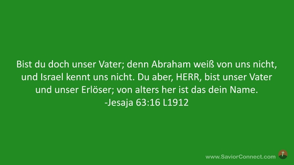 Bist du doch unser Vater; denn Abraham weiß von uns nicht, und Israel kennt uns nicht. Du aber, HERR, bist unser Vater und unser Erlöser; von alters her ist das dein Name. -Jesaja 63:16 L1912
