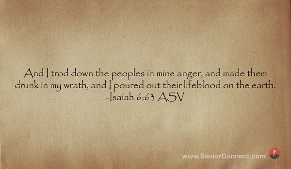 Und ich habe die Völker zertreten in meinem Zorn und habe sie trunken gemacht in meinem Grimm und ihr Blut auf die Erde geschüttet.” -Jesaja 63:6 L1912