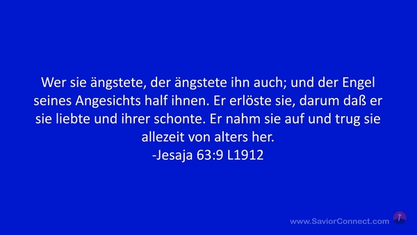 Wer sie ängstete, der ängstete ihn auch; und der Engel seines Angesichts half ihnen. Er erlöste sie, darum daß er sie liebte und ihrer schonte. Er nahm sie auf und trug sie allezeit von alters her. -Jesaja 63:9 L1912