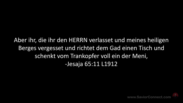 Aber ihr, die ihr den HERRN verlasset und meines heiligen Berges vergesset und richtet dem Gad einen Tisch und schenkt vom Trankopfer voll ein der Meni, -Jesaja 65:11 L1912