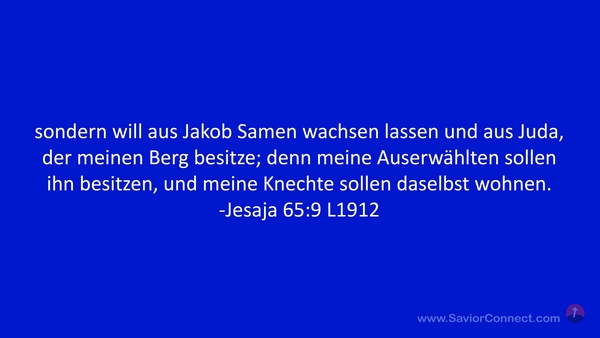 sondern will aus Jakob Samen wachsen lassen und aus Juda, der meinen Berg besitze; denn meine Auserwählten sollen ihn besitzen, und meine Knechte sollen daselbst wohnen. -Jesaja 65:9 L1912