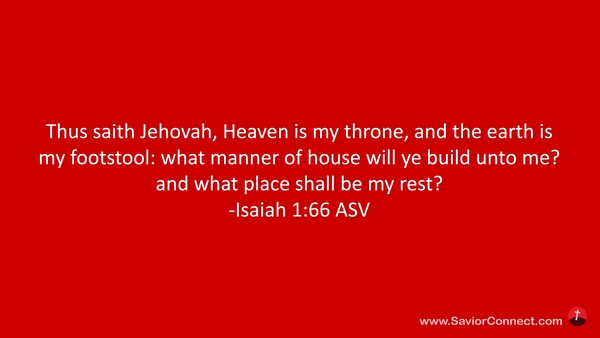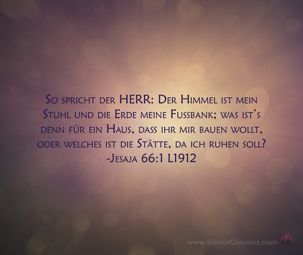 So spricht der HERR: Der Himmel ist mein Stuhl und die Erde meine Fußbank; was ist's denn für ein Haus, daß ihr mir bauen wollt, oder welches ist die Stätte, da ich ruhen soll? -Jesaja 66:1 L1912