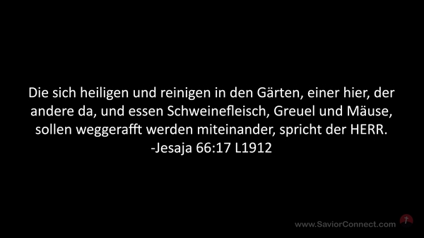 Die sich heiligen und reinigen in den Gärten, einer hier, der andere da, und essen Schweinefleisch, Greuel und Mäuse, sollen weggerafft werden miteinander, spricht der HERR. -Jesaja 66:17 L1912