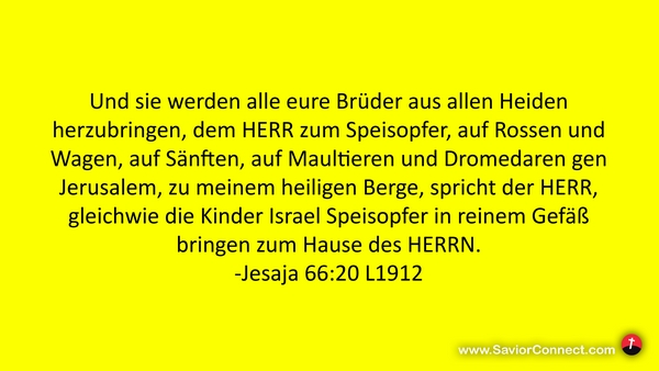 Und sie werden alle eure Brüder aus allen Heiden herzubringen, dem HERR zum Speisopfer, auf Rossen und Wagen, auf Sänften, auf Maultieren und Dromedaren gen Jerusalem, zu meinem heiligen Berge, spricht der HERR, gleichwie die Kinder Israel Speisopfer in reinem Gefäß bringen zum Hause des HERRN. -Jesaja 66:20 L1912