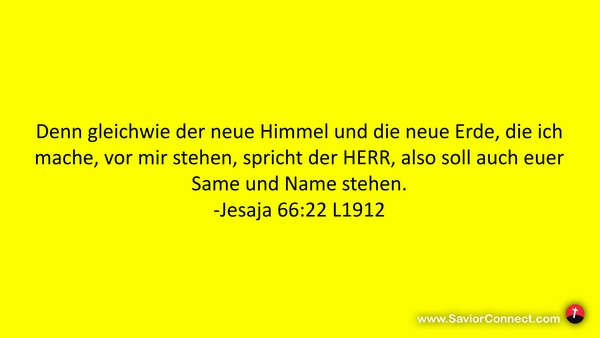 Denn gleichwie der neue Himmel und die neue Erde, die ich mache, vor mir stehen, spricht der HERR, also soll auch euer Same und Name stehen. -Jesaja 66:22 L1912