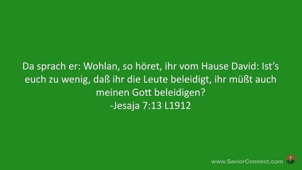 Da sprach er: Wohlan, so höret, ihr vom Hause David: Ist's euch zu wenig, daß ihr die Leute beleidigt, ihr müßt auch meinen Gott beleidigen? -Jesaja 7:13 L1912