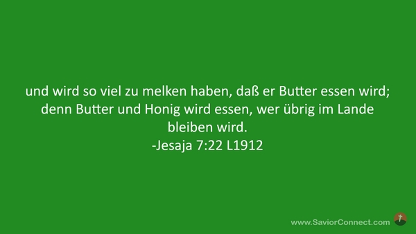 und wird so viel zu melken haben, daß er Butter essen wird; denn Butter und Honig wird essen, wer übrig im Lande bleiben wird. -Jesaja 7:22 L1912