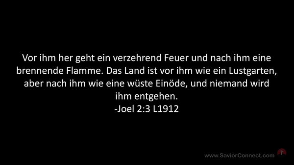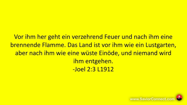 Vor ihm her geht ein verzehrend Feuer und nach ihm eine brennende Flamme. Das Land ist vor ihm wie ein Lustgarten, aber nach ihm wie eine wüste Einöde, und niemand wird ihm entgehen. -Joel 2:3 L1912
