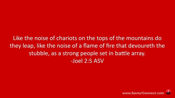 Sie sprengen daher oben auf den Bergen, wie die Wagen rasseln, und wie eine Flamme lodert im Stroh, wie ein mächtiges Volk, das zum Streit gerüstet ist. -Joel 2:5 L1912