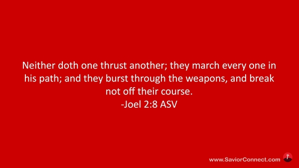 Keiner wird den andern irren; sondern ein jeglicher wird in seiner Ordnung daherfahren und werden durch die Waffen brechen und nicht verwundet werden. -Joel 2:8 L1912