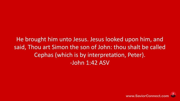 und führte ihn zu Jesu. Da ihn Jesus sah, sprach er: Du bist Simon, Jona's Sohn; du sollst Kephas (Fels) heißen. -Johannes 1:42 L1912