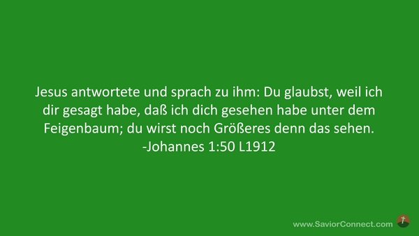 Jesus antwortete und sprach zu ihm: Du glaubst, weil ich dir gesagt habe, daß ich dich gesehen habe unter dem Feigenbaum; du wirst noch Größeres denn das sehen. -Johannes 1:50 L1912